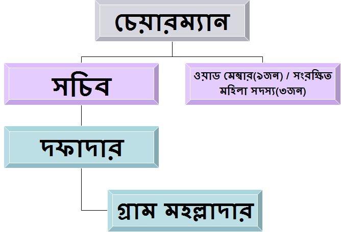 গঠন: ১ জন চেয়ারম্যানের আওতায় একজন সচিব সরকার কর্তৃক নিয়োগপ্রাপ্ত, সচিবের আওতায় ৯ জন পুরুষ মেম্বার ও ৩ জন মহিলা মেম্বার এবং ১ একজন দফাদার ৯ জন মহল্লাদার পরিচালিত।